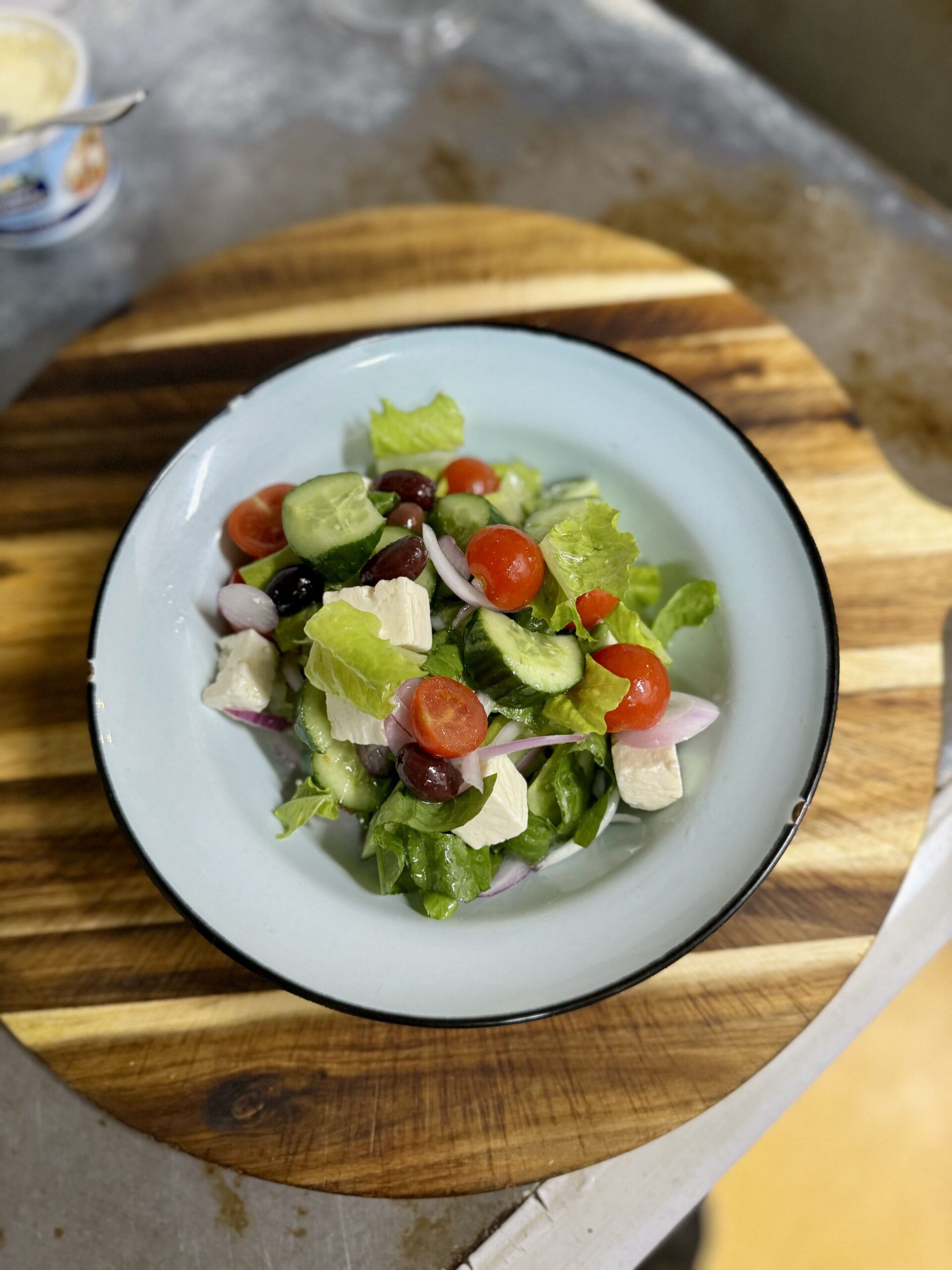 A colourful mix of crisp cucumbers, juicy tomatoes, olives, and feta cheese with a refreshing vinaigrette.